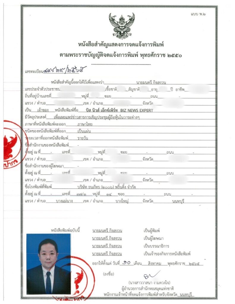 หนังสือพิมพ์ ข้อมูลธุรกิจ ได้จดแจ้งการพิมพ์ถูกต้อง เลขใบอนุญาตเลขที่ สสช.29/2565